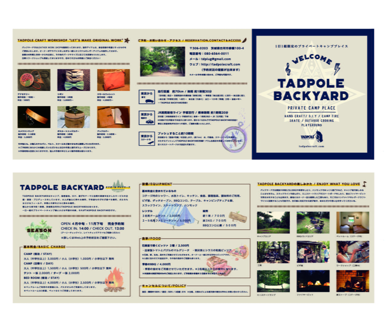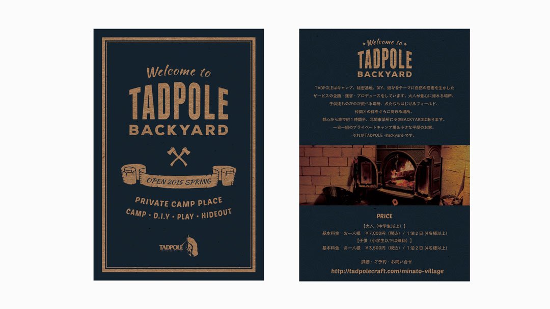 - 冬季に長野県白馬村でバックカントリーガイドをしているKくんのレザー工房件遊び場「Tadpole Backyard」のコミュニケーションツールのデザインを制作いたしました。革細工「Tadpole Craft」のワークショップやプライベートキャンプ場の運営をしています。